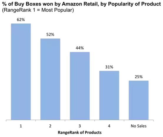 而且卖家要知道,产品越受欢迎就越有可能赢得亚马逊Buy Box。以下是产品受欢迎程度与赢得亚马逊Buy Box机率之间的数据统计图,其中1表示最受欢迎: