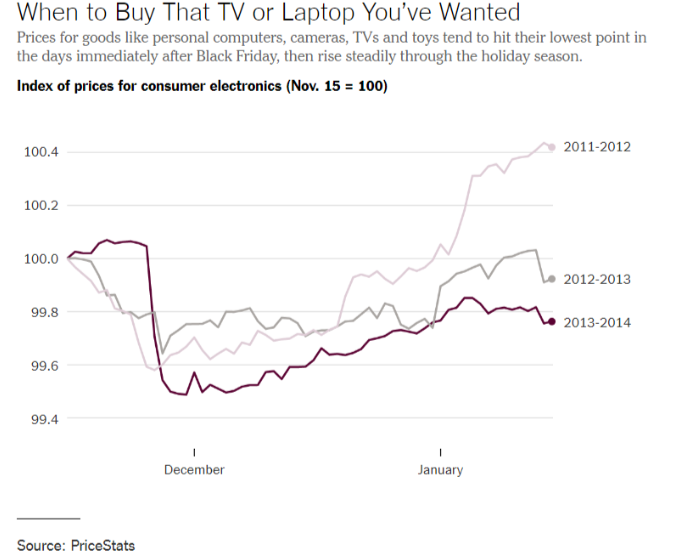 (如个人电脑、相机、电视和玩具这类产品的价格一般会在黑五后跌到最低点,并在随后的节日季里平稳上升)
