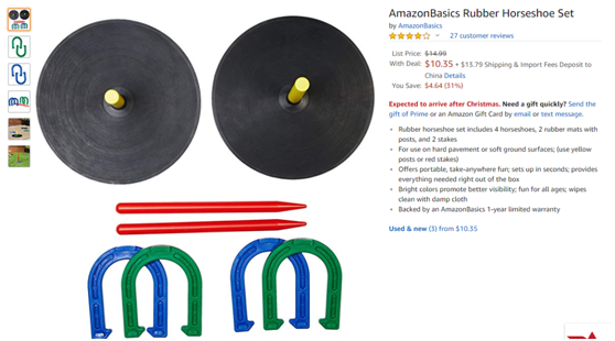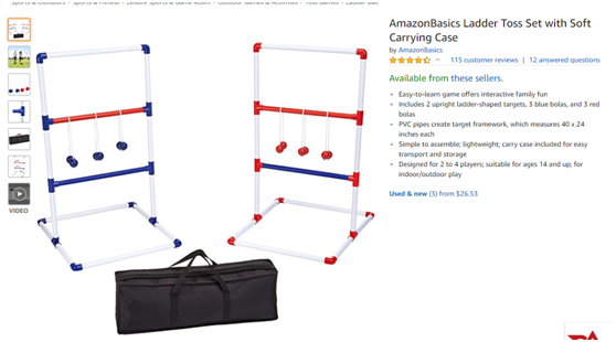 据可靠消息透露,亚马逊自营品牌AmazonBasics将推出系列玩具类产品。目前,AmazonBasics已经着手研发软体玩具和玩具收纳柜,listing方面亚马逊似乎已经开始着手创建,目前能看到的仅有 rubber horseshoe set(橡胶马蹄套装)和 ladder toss set(户外游戏套装)这两款玩具,被归类为运动和户外装备。