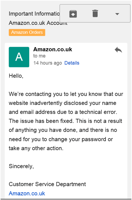 今年9月,《华尔街日报》爆出亚马逊员工涉嫌向卖家出售客户数据的新闻。为解决该问题,亚马逊开启了一系列调查,并已于10月删除了一系列员工。但两个月后,仍有客户被告知他们的信息已被披露,如下图。