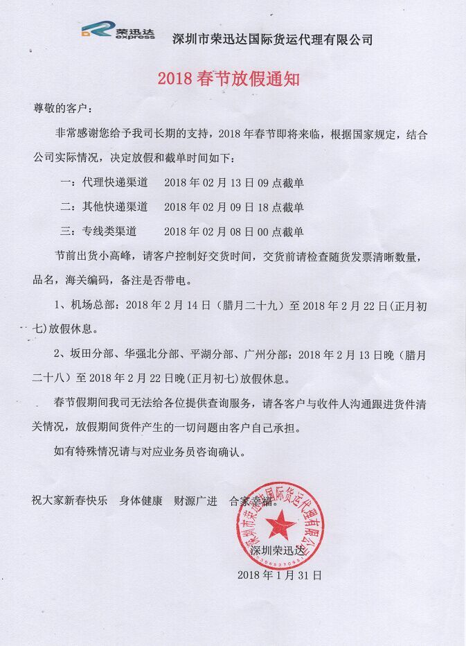 春节假期间我司无法给各位提供查询服务,请各客户与收件人沟通跟进货件清关情况,放假期间货件产生的一切问题由客户自己承担。